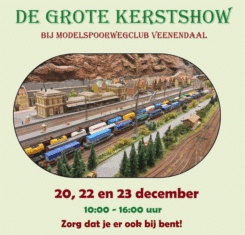 Een echte belevenis voor jong en oud en daarom een superleuk uitje in de Kerstvakantie: de Kerstshow van de ModelSpoorwegClub Veenendaal (MSCV). Op 20, 22 en 23 december rijden de treinen tussen 10.00 en 16.00 uur. Entree: volwassenen € 3. Kinderen tot 14 jaar € 1,50. Gezin (max 4 personen) € 7,50